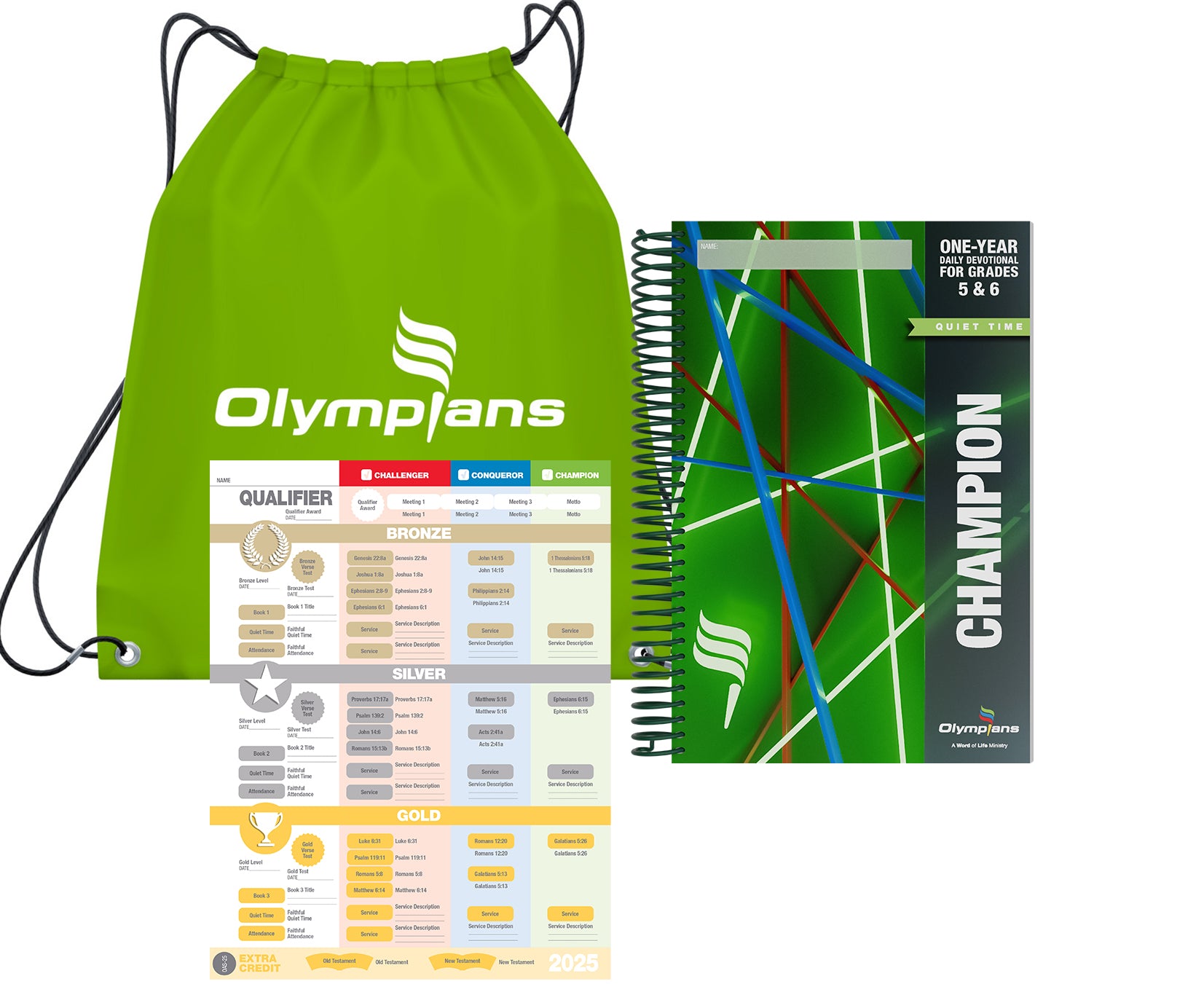 Each Champion Quiet Time Pack for grades 5-6 includes a grade-appropriate Quiet Time Diary with attached Scripture memory verse sheets in five selected versions, plus a Record/Award Sticker Sheet for leaders to keep track of each student’s accomplishments. This pack also includes a green drawstring bag.