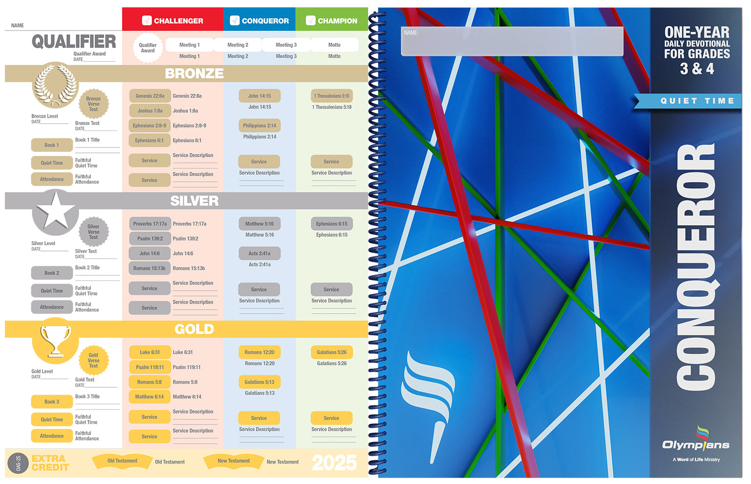 Each Conqueror Quiet Time Diary Pack for grades 3-4 includes a grade-appropriate Quiet Time Daily Devotional with attached Scripture memory verse sheets in five selected versions, plus a Record/Award Sticker Sheet for leaders to keep track of each student’s accomplishments.